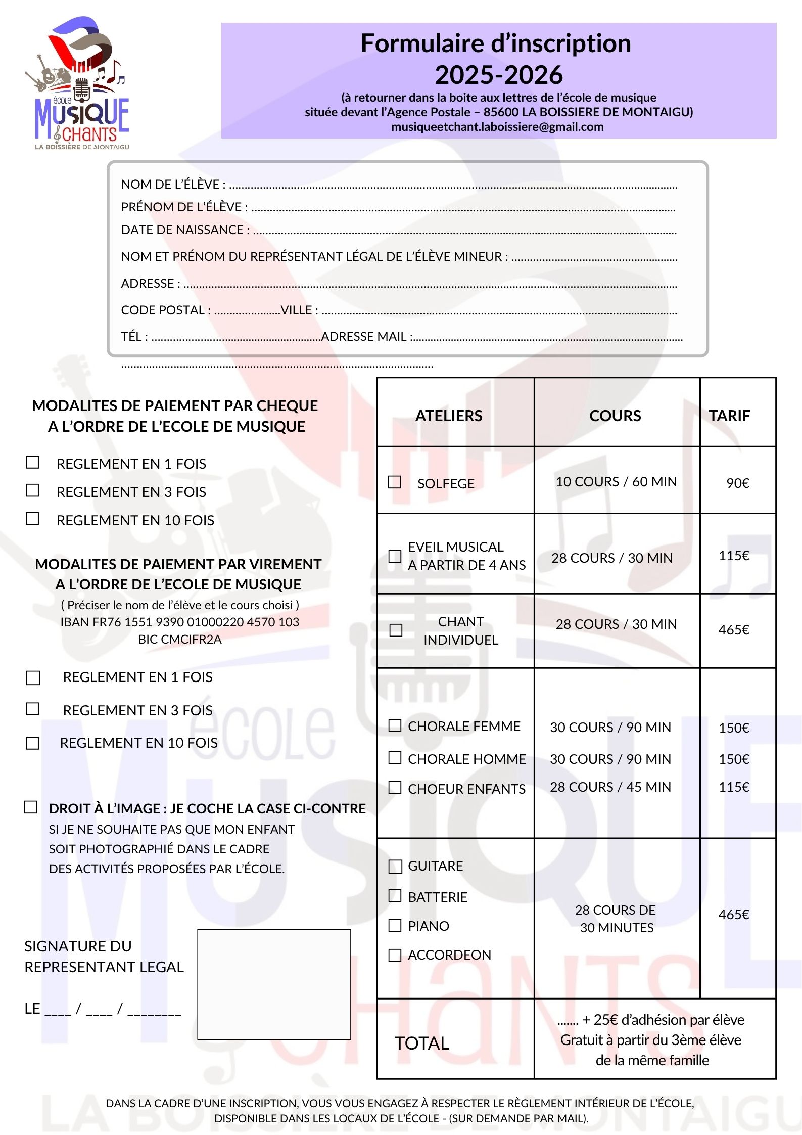 Règlement par cheque à l'ordre de l'Ecole de Musique de la Boissière de Montaigu. Paiement en plusieurs fois accepté. ( Préciser le nom de l'élève et le cours choisi)